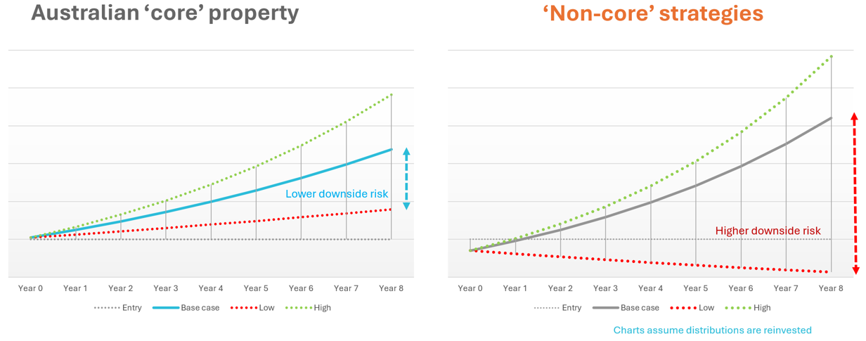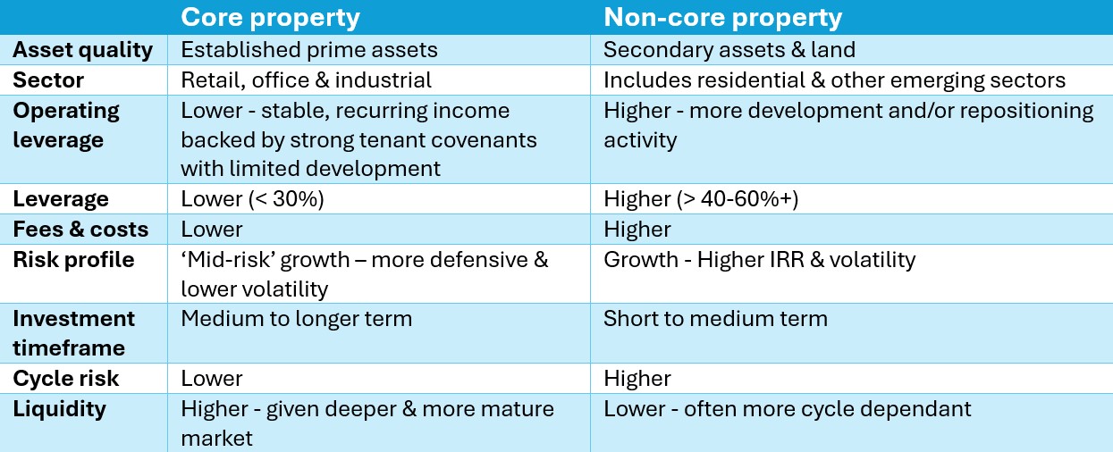 But if the strategy becomes non-core, it becomes more cycle-dependant as it includes riskier activities such as high leverage, lower asset quality, speculative outcomes, increased operational risk such as development and short-term capital plays — then the defensive benefit of property can disappear.
